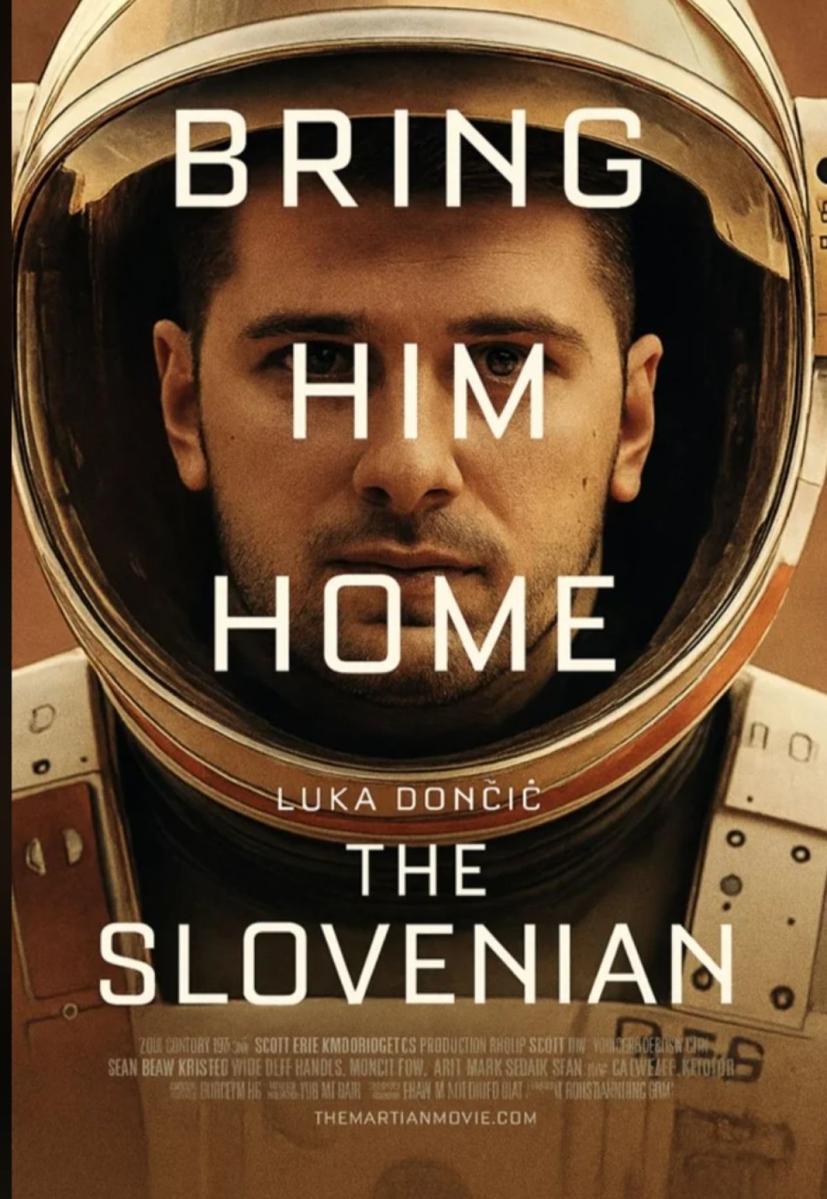 Kot lahko vidite spodaj, je skupina navijačev celo preoblikovala plakat filma The Martian v The Slovenian (prevod ni potreben) z Dončićevim obrazom namesto podobo slovitega filmskega igralca, prevod slogana v slovenščino pa se seveda glasi 'Pripeljite ga domov'. V filmu kultnega režiserja Ridleyja Scotta je Damonov lik obtičal na Marsu in seveda navijači delajo vzporednico s tem, da naj bi njihov junak obtičal v Los Angelesu ter ga je treba vrniti domov - ne na Zemljo, temveč v Dallas in v dvorano American Airlines Center.