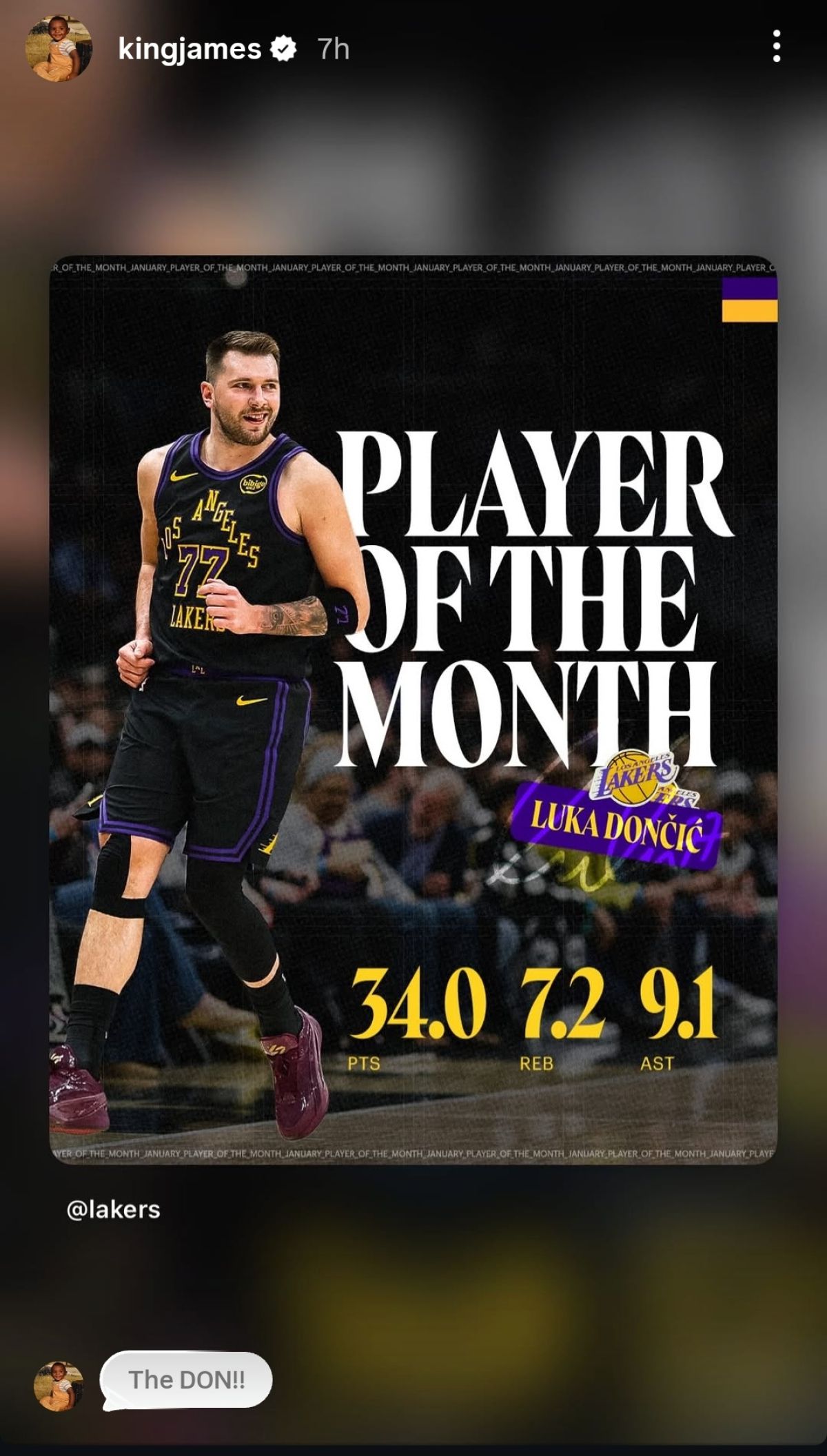 Slovenski košarkarski zvezdnik je leto dni po tem, ko so ga iz Dallasa zamenjali v Los Angeles Lakers postal najboljši igralec meseca na zahodu. To mu je uspelo sploh prvič, odkar je postal član ekipe iz mesta angelov. Čeprav Lakersi niso imeli najbolj bleščečega izkupička (devet zmag in sedem porazov), pa je bil Dončić velikokrat edina svetla točka tudi ob porazih. Povprečno je prvi mesec leta 2026 dosegal po 34 točk, 7,2 skoka in 9,1 asistence na tekmo.