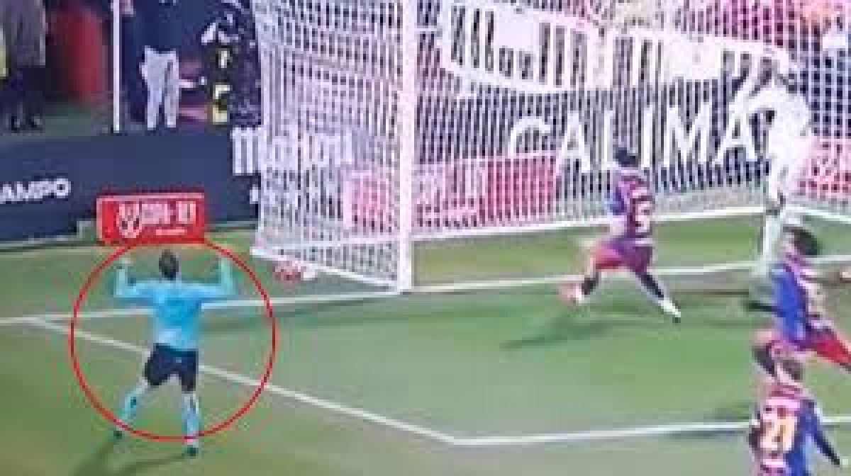Kot da bi se v trenutkih, ko je marsikdo že videl zadetek, a se ta nato ni zgodil, spozabil. V delčku sekunde sta mu obe roki ušli v zrak, kot da bi ga premagala čustva ob kombinaciji preprečenega veselja in razočaranega spoznanja - vsaj tako si gesto razlagajo v Kataloniji. Spodaj v fotografiji iz zajema zaslona vidite, v kako neprijetnem trenutku se je znašel delivec pravice, vse skupaj pa si na tej povezavi lahko ogledate tudi v posnetku. In se o tem, ali je sodnik v sebi želel proslaviti gol Albaceteja, nato pa ga je šokiral preobrat, prepričate sami.