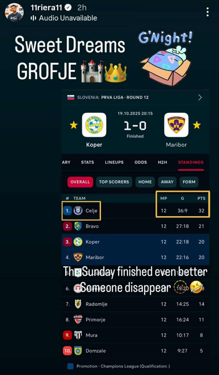 Kar 14 točk zadaj pa se na 5. mestu nahaja Olimpija, ki si jo je Albert Riera v nedeljo zvečer brutalno privoščil. Po zmagi Kopra je namreč objavil lestvico slovenske lige in zapisal: "Nedelja se je zaključila še bolje. Nekdo je izginil." Ta nekdo se (najverjetneje) nanaša Olimpijo, ki je po zmagi Koprčanov zdaj izpadla iz prvih 4 mest.