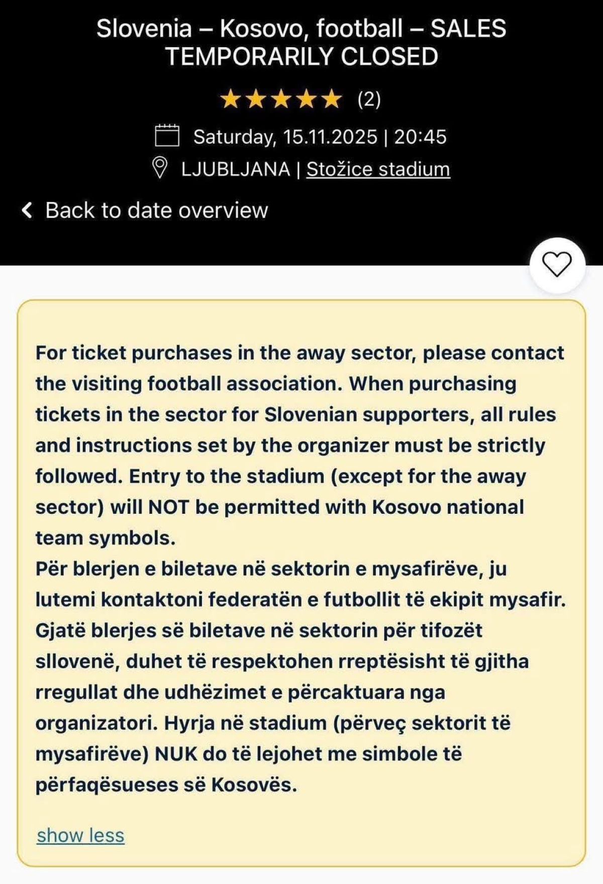 Na spletni strani Nogometne zveze Slovenije so zapisali uradno sporočilo: "Slab mesec pred zadnjo tekmo slovenske nogometne reprezentance v kvalifikacijah za svetovno prvenstvo 2026 so pošle še zadnje vstopnice za tekmo med Slovenijo in Kosovom. Stožice bodo 15. novembra vnovič pokale po šivih, Nogometna zveza Slovenije pa vse imetnike vstopnic poziva k športnemu obnašanju na tribunah. Vstop na stadion (z izjemo gostujočega sektorja) bo mogoč le z obeležji Slovenije in slovenske reprezentance."
