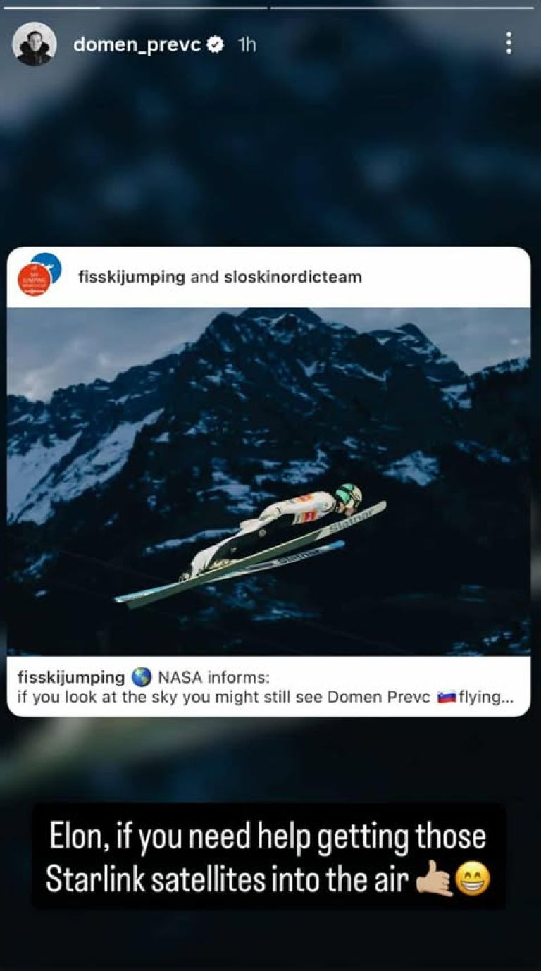 Pri FIS-u so zapisali kar, da ameriška vesoljska agencija NASA sporoča, da "če pogledate v zrak, še vedno lahko vidite Domna Prevca med letom." Sam pa je v dobrem razpoloženju na to objavo odgovoril s pozivom najbogatejšemu Zemljanu Elonu Musku, ki ima med drugim v lasti podjetje SpaceX, ki v vesolje pošilja svoje rakete. "Elon, če potrebuješ pomoč spraviti satelite Starlink v nebo, me pokliči," se je na Instagramu pošalil Prevc, ki več kot očitno zna uživati v teh najboljših trenutkih njegove dolge kariere.