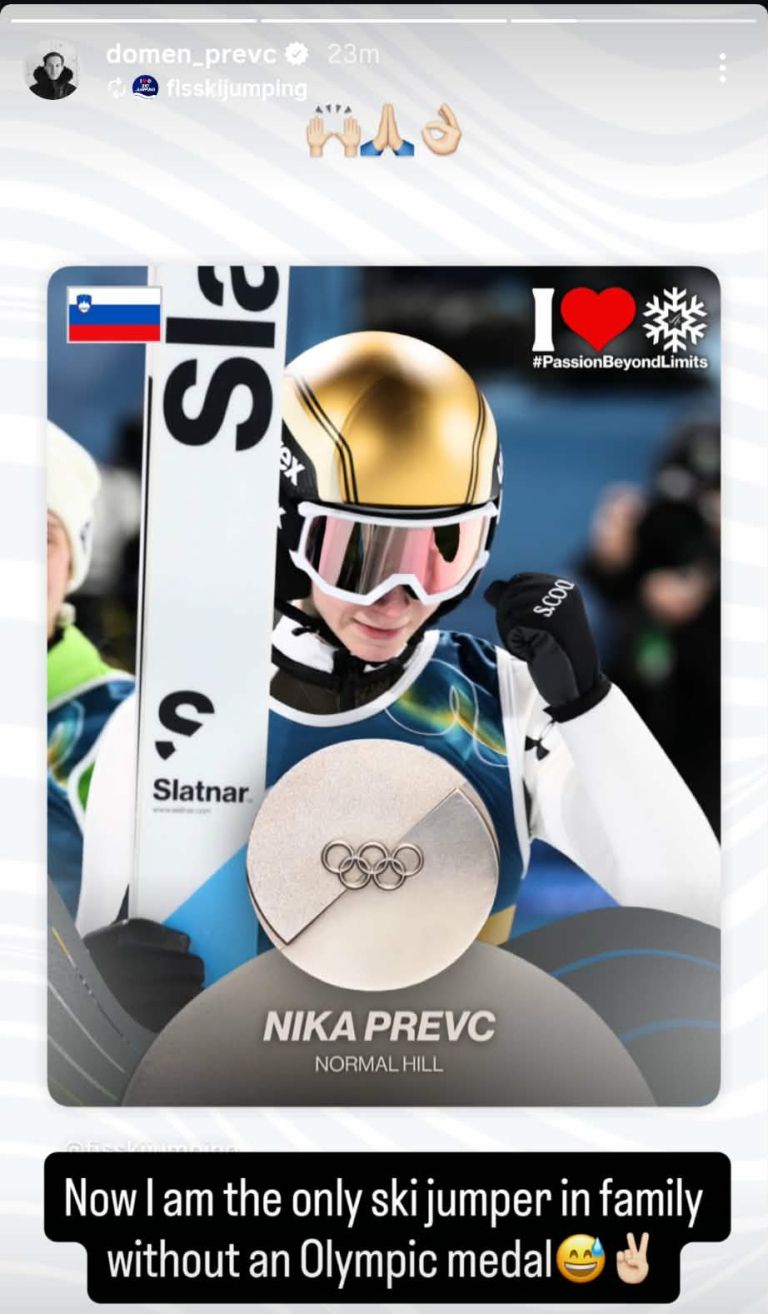 Sestrin nastop je spremljal z velikim zanimanjem, po koncu tekme pa se je oglasil na način, ki ga ni pričakoval nihče. "Zdaj sem pa edini smučarski skakalec v družini, ki nima olimpijske medalje," je ob čestitki sestri Niki šaljivo zapisal Domen.